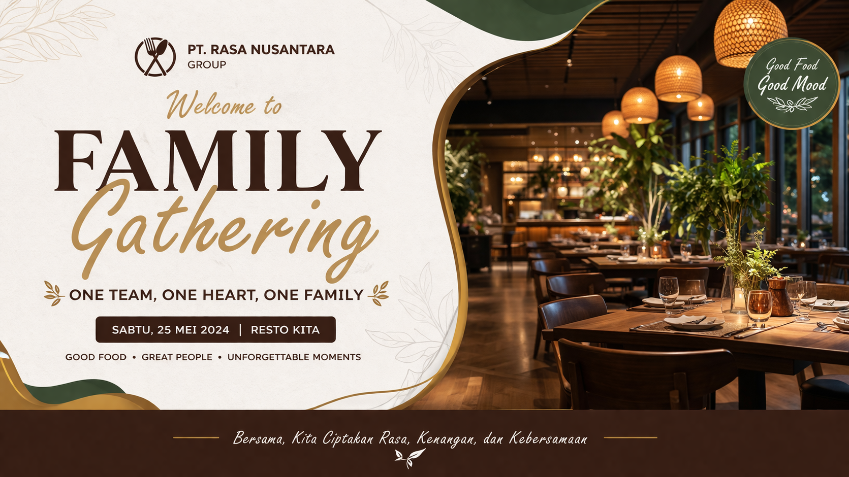 Tips Desain: Masukkan foto tim yang sedang tersenyum tulus di sisi kanan atau kiri agar suasana tetap terasa hangat meski formal.