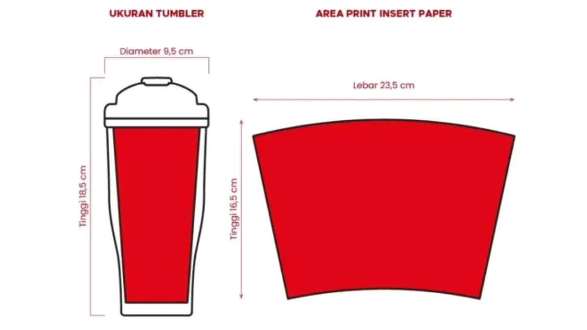 Jika ukuran insert paper merupakan dimensi keseluruhan kertas lapisan tumbler, berbeda dengan luas area yang dapat diberi cetakan desain. Dengan standar insert paper untuk ukuran tumbler custom, area yang bisa kamu beri desain gambar atau foto hanya 19 cm x 6 cm. Bila lebih dari itu, tumbler tidak tampak menarik.