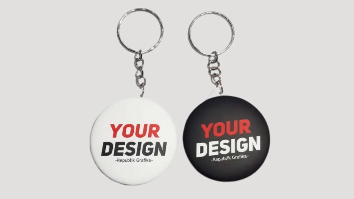 Biasanya, gantungan kunci menggunakan standar ukuran pin bulat, yaitu: 5,8 cm. Namun, jika ingin menggunakan ukuran pin standar juga tidak masalah, disesuaikan dengan kebutuhan cetaknya.